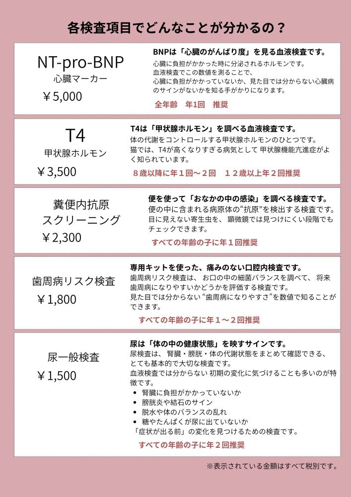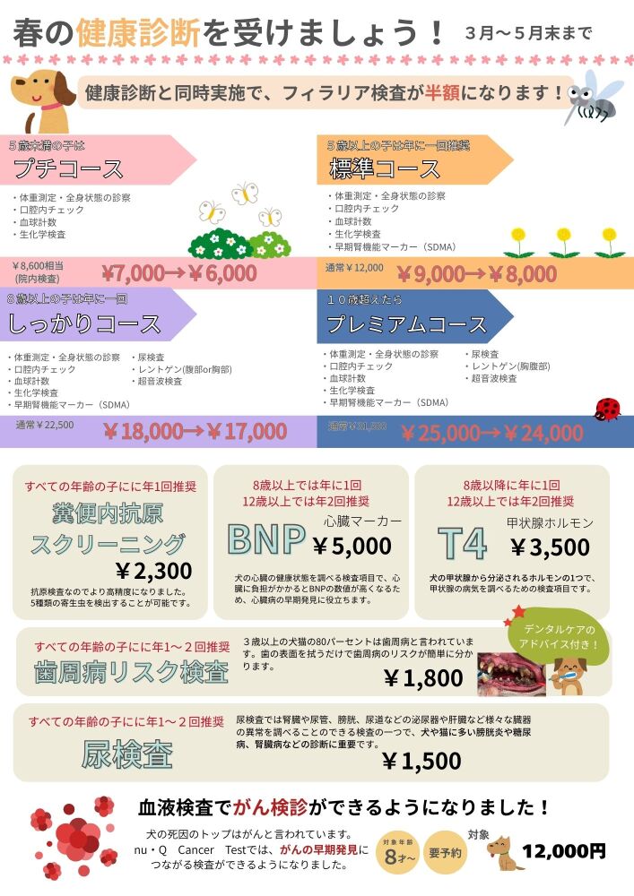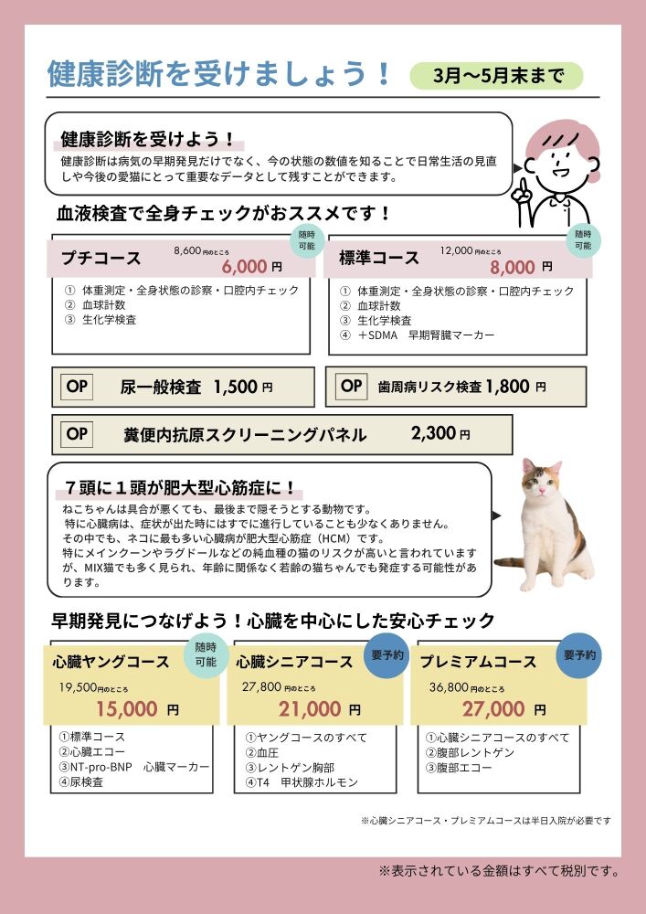 大切な家族がこれからも元気に毎日を過ごせるように。 春の健康診断をおすすめしています✨当院では、直接その子に合わせたプランをお話ししながらご案内しております。ねこちゃんは こちらのコースよりご案内しております。